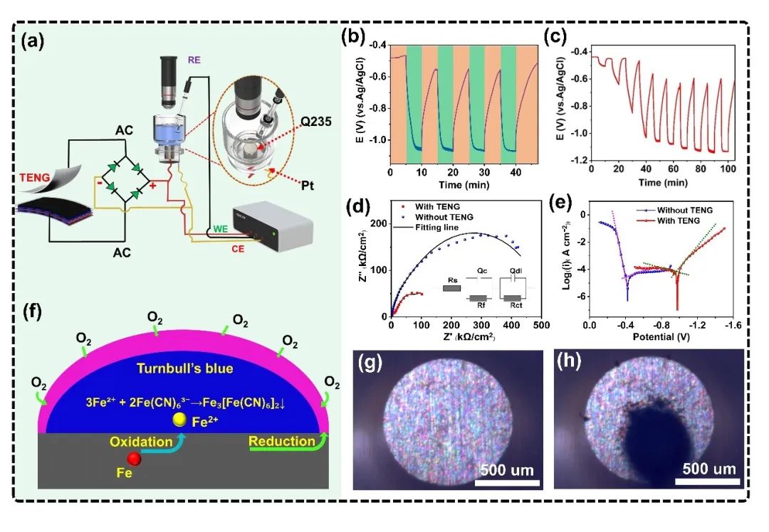 金属腐蚀严重影响海洋钢结构服役寿命,电化学防护是延长金属服役年限的重要手段。然而传统的阴极保护存在着能源和资源浪费、环境污染等问题,为了解决这一难题,开发新型清洁能源实现电化学腐蚀防护过程绿色化势在必行。近年来,摩擦纳米发电机(TENG)可以收集和捕获周围环境中的机械能,并能将其转化成电能已引起广泛关注,TENG技术基于不同材料之间的接触起电和静电感应耦合效应,具有材料可用性广、重量轻、成本低、低频能量转化效率高等优点。海洋环境中存在丰富的可利用的机械能,如风能、波浪能、潮汐能等,这为利用TENG实现电化学腐蚀防护绿色化提供了便利的能量来源。