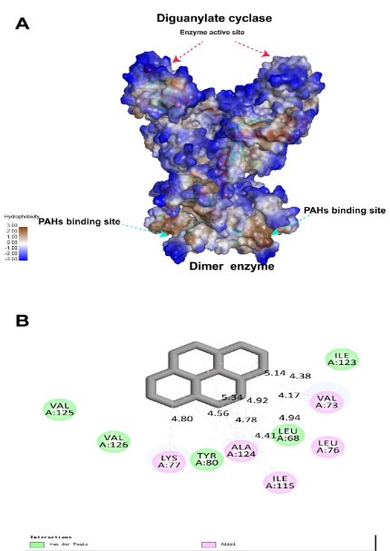 尽管国内外已经能对海洋PAHs降解菌多样性与代谢途径研究有了较为系统的研究,但是细菌是如何发现环境中PAHs、如何将胞外的PAHs信号转导到细胞内,并驱动趋化、吸收与代谢过程等等,这些过程尚鲜为人知。为回答这些问题,我们以海洋环境中广泛分布的PAHs降解细菌Cycloclasticus为研究对象开展相关研究,确定了参与多环芳烃胞内感受、信号转导和不同种类PAHs降解途径调节的关键基因(图1)。结果显示,多环芳烃特异性地与二聚体环苷酸环化酶(PdgC)结合,导致环二聚体GMP (c-di-GMP)的生成(图2),随后与两种CRP/FNR家族调节蛋白DPR-1和DPR-2结合(图3)。c-di-GMP分别激活DPR-1和DPR-2的转录功能,正向调控芘和菲/萘等PAHs的降解途径基因表达。这是国际上首次对细菌降解PAHs相关的细胞内信号转导途径的报道。研究结果有助于深入认识细菌的烃代谢调控网络及其对PAHs污染环境的响应机制。 该研究得到了国家自然科学基金“水圈微生物”重大研究计划重点项目(91851203)、国家自然科学基金“优青”项目(41922041)及海洋三所创新团队建设经费的支持。