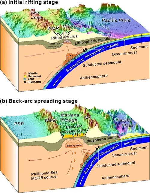 图3 马里亚纳俯冲带裂谷初始阶段及成熟弧后阶段物质循环模式图