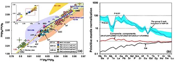 该研究对马里亚纳岛弧最北端初始裂谷期(24°N)玄武岩橄榄石内熔体包裹体进行了主微量元素及Pb同位素分析,并与马里亚纳海槽和岛弧玄武岩内熔体包裹体进行了对比。研究结果发现,马里亚纳海槽玄武岩内熔体包裹体具有与E-MORB相似的微量元素和Pb同位素组成。相比于海槽和岛弧玄武岩内熔体包裹体,初始裂谷期熔体包裹体具有较高的K含量和放射性Pb同位素组成,接近HIMU地幔端员(图2),这表明初始裂谷期地幔源区具有HIMU物质的存在。HIMU(high-μ,高U/Pb比值,206Pb/204Pb>20.5)地幔与亏损地幔(DM)、富集地幔1(EM 1)和富集地幔2(EM 2)为地球深部地幔的四种主要类型。HIMU地幔通常与地幔柱活动及深部物质循环有关,然而地球物理资料显示研究区并没有典型地幔柱的存在,因此这种组分最可能来自于HIMU型俯冲物质的深部循环。