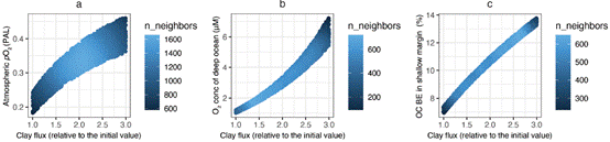 图3. 全球生物地球化学循环模型模拟陆源黏土输入通量对海洋有机碳埋藏效率、大气和深海氧含量的促进作用