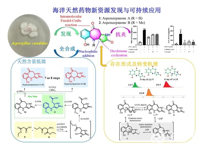 海洋天然产物已被证明是原创新药研发的重要资源。从海洋药源微生物中寻找具有显著药理活性的先导分子,则展现出重要的研究价值和应用潜力。研究团队聚焦国家开发重大创新药物的战略需求,长期从事海洋天然药物先导化合物的发现与优化研究。从一株海洋来源真菌Aspergillus candius中发现了两个具有6/7/5环系的新骨架生物碱(±)-asperazepanone A和(+)-asperazepanone B。综合运用现代波谱、高分辨质谱、CD光谱和X单晶衍射等技术,完整解析上述两个化合物的精确结构。在研究过程中,意外发现(±)-asperazepanone A以消旋体形式存在,而(+)-asperazepanone B则以光学活性方式存在。经过团队系统研究证实,(+)-asperazepanone A是真正海洋真菌来源的天然产物,而其对映异构体(−)-asperazepanone A则是在发酵分离过程中形成的人工产物,相关的消旋机理也得到了推导与验证。