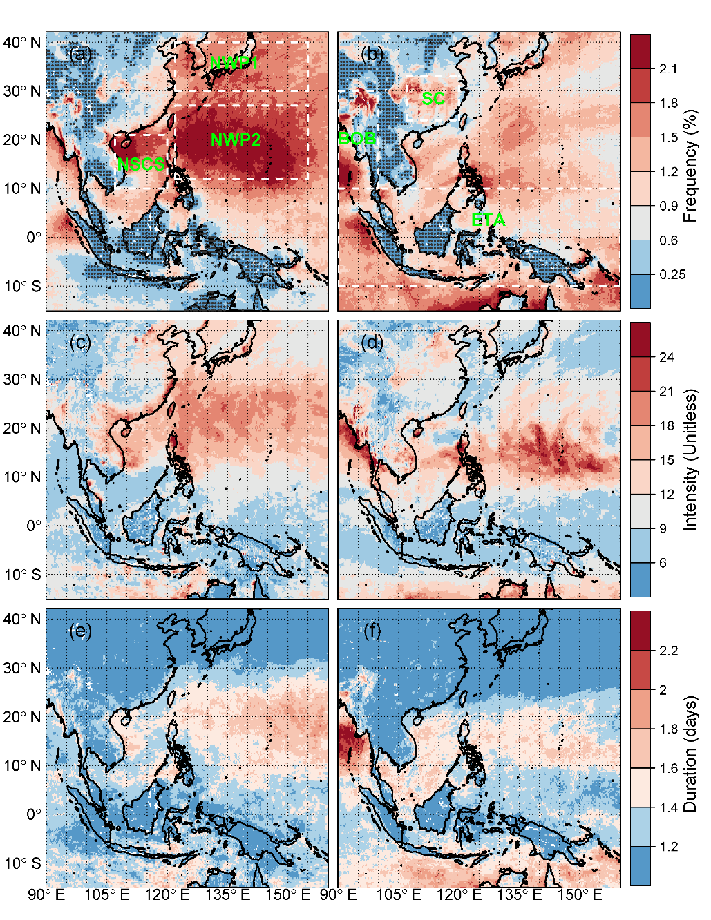 图1. 1979-2020年印太区域复合型极端风雨事件气候态平均(a,b)频率(%),(c, d)无量纲强度和(e, f)持续时间(天)。左侧为夏半年结果,右侧为冬半年结果。