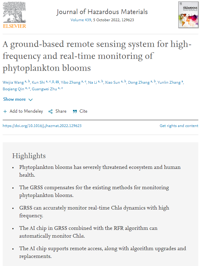近日,中国科学院南京地理与湖泊研究所张运林研究员团队联合南京中科深瞳科技研究院有限公司、杭州海康威视数字技术股份有限公司,基于水色遥感原理,研发了一款陆基高光谱遥感监测仪及原位高频在线监测系统,实现了藻类水华连续、精准、实时监测,有效弥补了现有方法的不足。相关研究成果发表在Journal of Hazardous Materials。