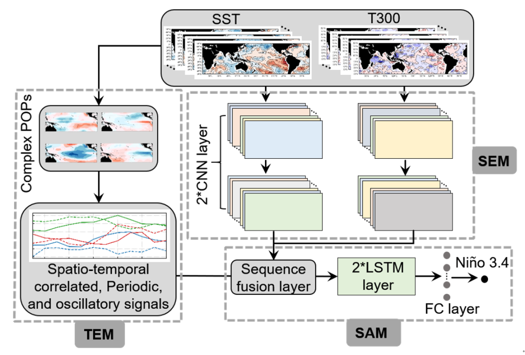 发生在热带太平洋的厄尔尼诺-南方涛动(ENSO)是气候系统中最强的年际变率信号,ENSO发生、发展对世界各地天气和气候都有重要影响,对其机制与预测研究有重大的科学意义和经济价值。半个多世纪的 ENSO研究已取得了重大成果,特别是对其提前月-季节尺度的实时预测成为可能,如当前的线性统计模式或基于数理方程的动力模式已能提前至少6个月对ENSO进行较好的实时预测,但预测技巧仍存在较大的误差和不确定性。另一方面,已有研究表明,基于大数据的神经网络模型可以极大地提高我们对ENSO的预测能力,但神经网络模型存在着可解释性差、计算复杂度高等问题。另外,目前关于人工智能改进ENSO预测等这方面的大部分研究主要停留在相关人工智能技术的直接应用上。考虑到地球科学研究中包括像ENSO这些现象具有物理过程清晰的时空结构和演变规律,如何把基于物理分析方法所得到的 ENSO时空演变特征与基于大数据的人工智能方法有机地结合起来进一步提高 ENSO预测技巧是气候变化领域的热点问题。