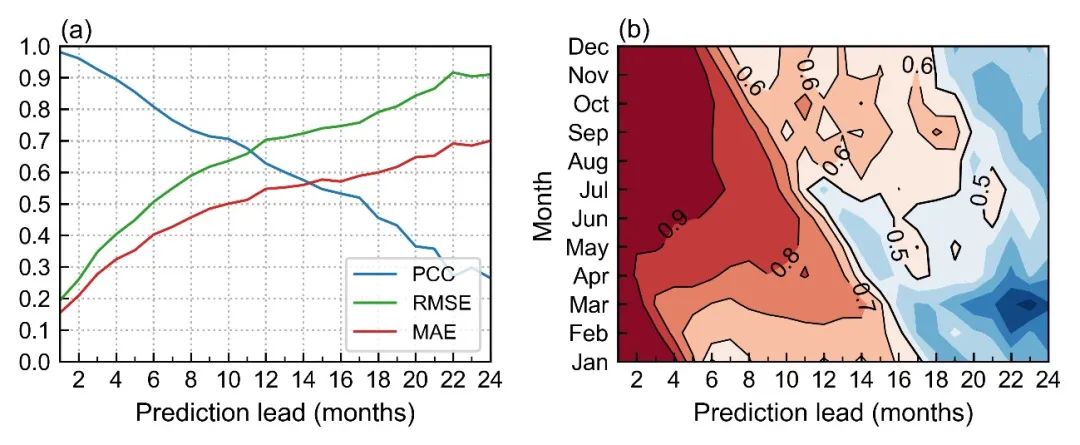 三种预测模式试验结果表明,POP-Net模型可以提前17个月提供有效的ENSO预测(相关系数>0.5)且大幅改善春季预报障碍问题。这种结合物理过程分析与基于大数据的人工智能技术的混合建模方法可通过强化有效信息提取并削减无关噪音影响来有效提升ENSO的预测水平,特别该研究将POP方法提取的多尺度物理信息融合于神经网络模型中,以增强模型对ENSO可预测信息的捕捉能力,进而提高了模型的ENSO预测水平,并显著改善了春季预报障碍(SPB)问题。这些初步研究为基于物理过程分析方法与神经网络相结合的混合建模研究提供了新思路。