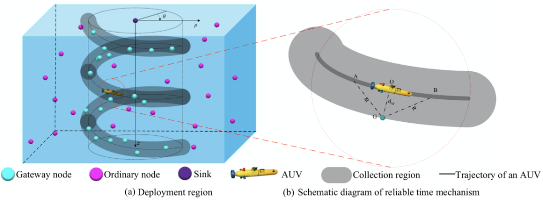为降低水声通信长时延和不稳定性对AUV之间信息交互的影响,进一步提升多AUV协作数据收集的效率,韩光洁团队提出了一种基于AUV状态预测的数据收集算法。通过位于不同收集区域内的节点簇之间的信任共享,实现不同区域内AUV之间的状态预测。根据状态预测的结果,使用启发式策略更新各区域内AUV的路径,并设计一种数据转发调度机制合理分配AUV和移动sink之间重叠的数据卸载间隔来减少AUV的下潜次数,以延长AUV的工作时长。