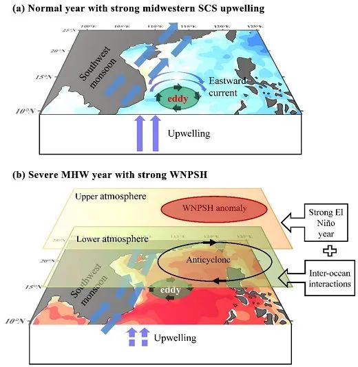 图2 与南海夏季海洋热浪相关的海-气环流模式示意图。(a) 正常年份南海夏季强盛的西南季风及其引发的上升流,(b) 西北太平洋副热带高压异常增强并西伸,导致南海夏季风减弱,上升流减弱,引发严重海洋热浪事件。