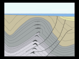 13、圣芭芭拉海峡挤压缩短过程中,油气向上运移和在背斜转折端富集的过程